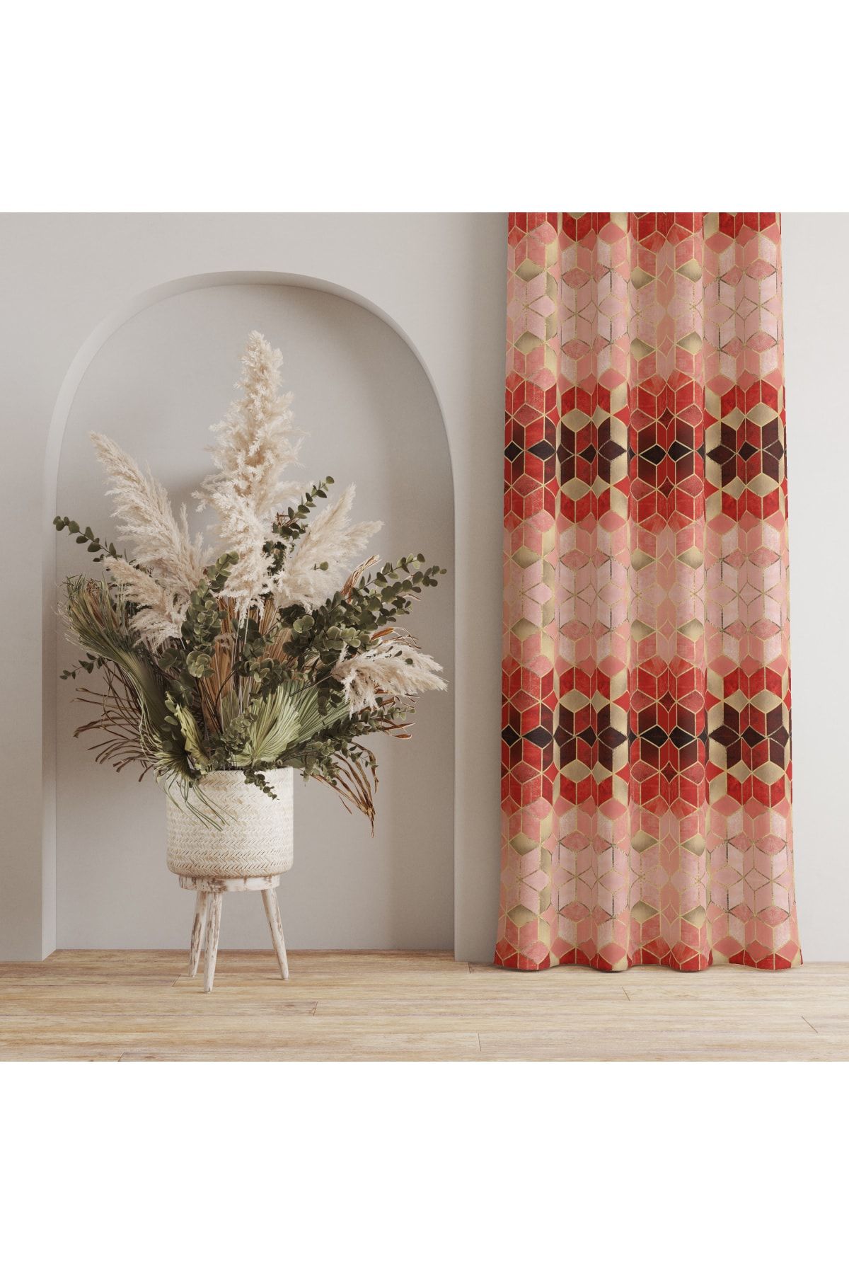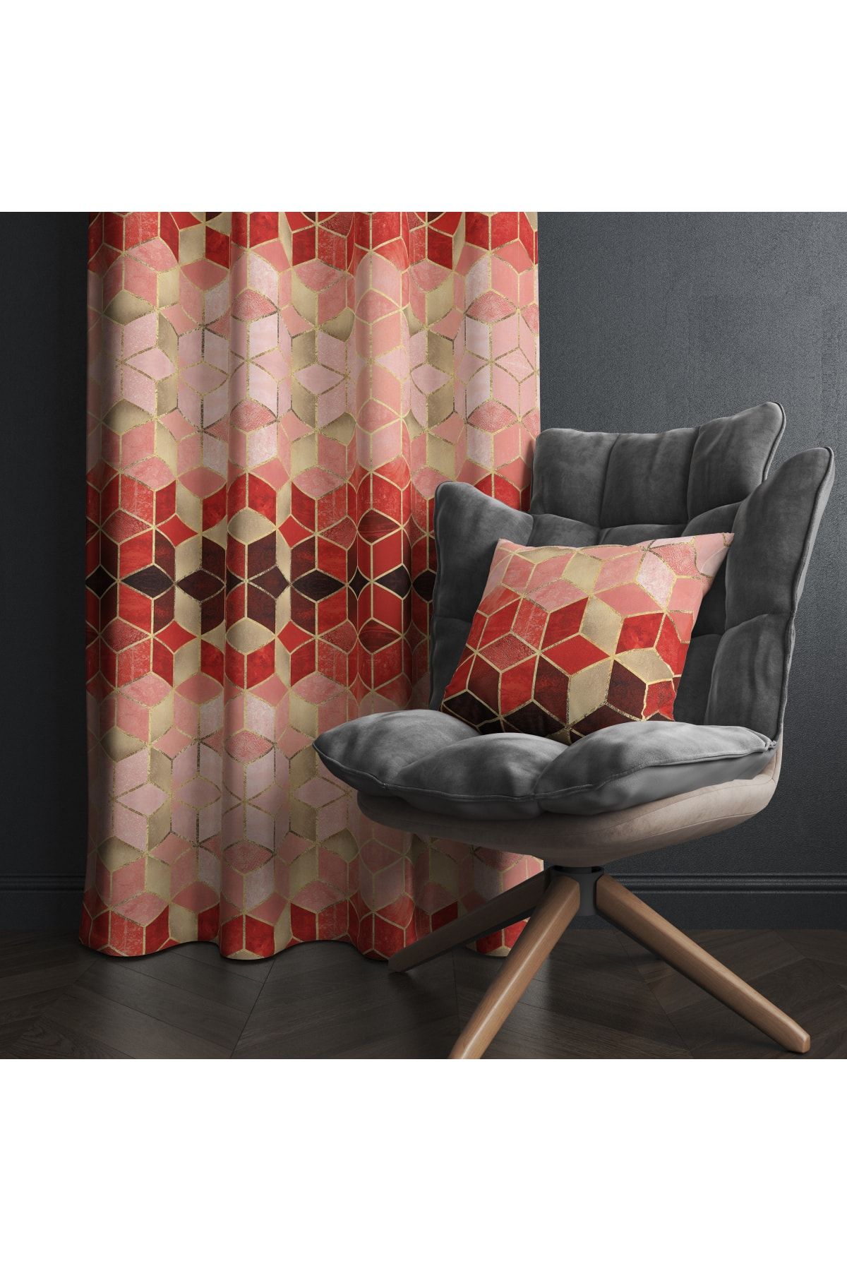 Kırmızı Mozaik Desenli Dijital Baskılı Fon Perde Tek Kanat