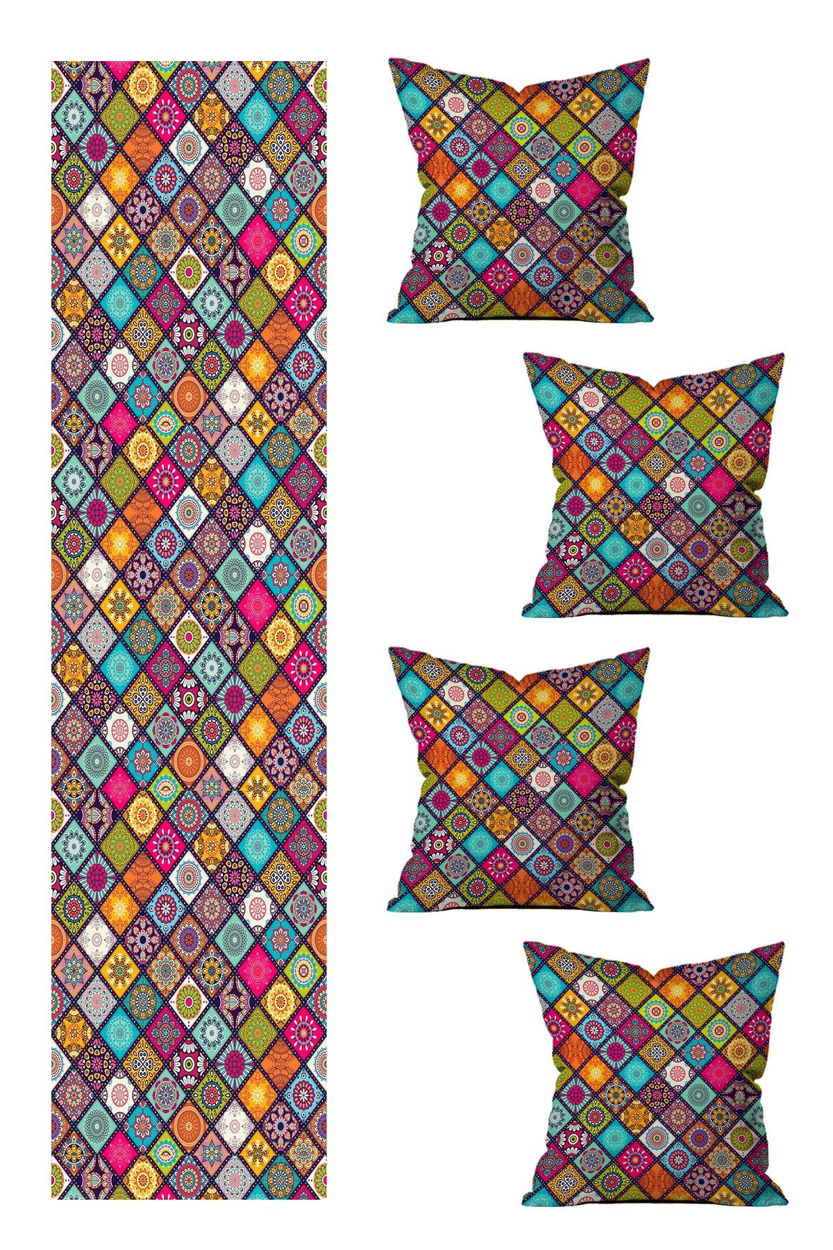 Özel Tasarım Runner Ve 4’lü Kırlent Kılıfı Seti 5 Parça (140×40) (43×43 Cm)