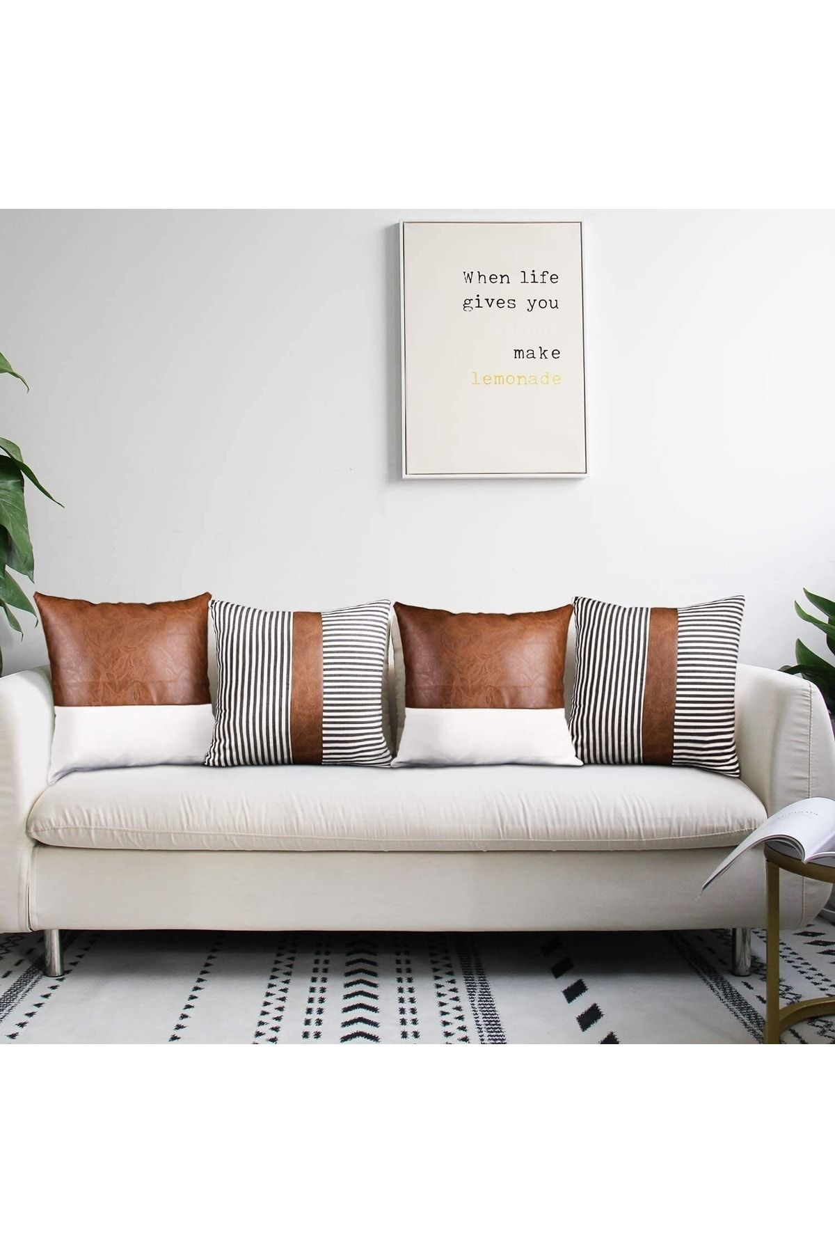 Premium Dekoratif Kırlent Kılıfı Seti Taba Deri Düz Çizgili Modern Tasarım