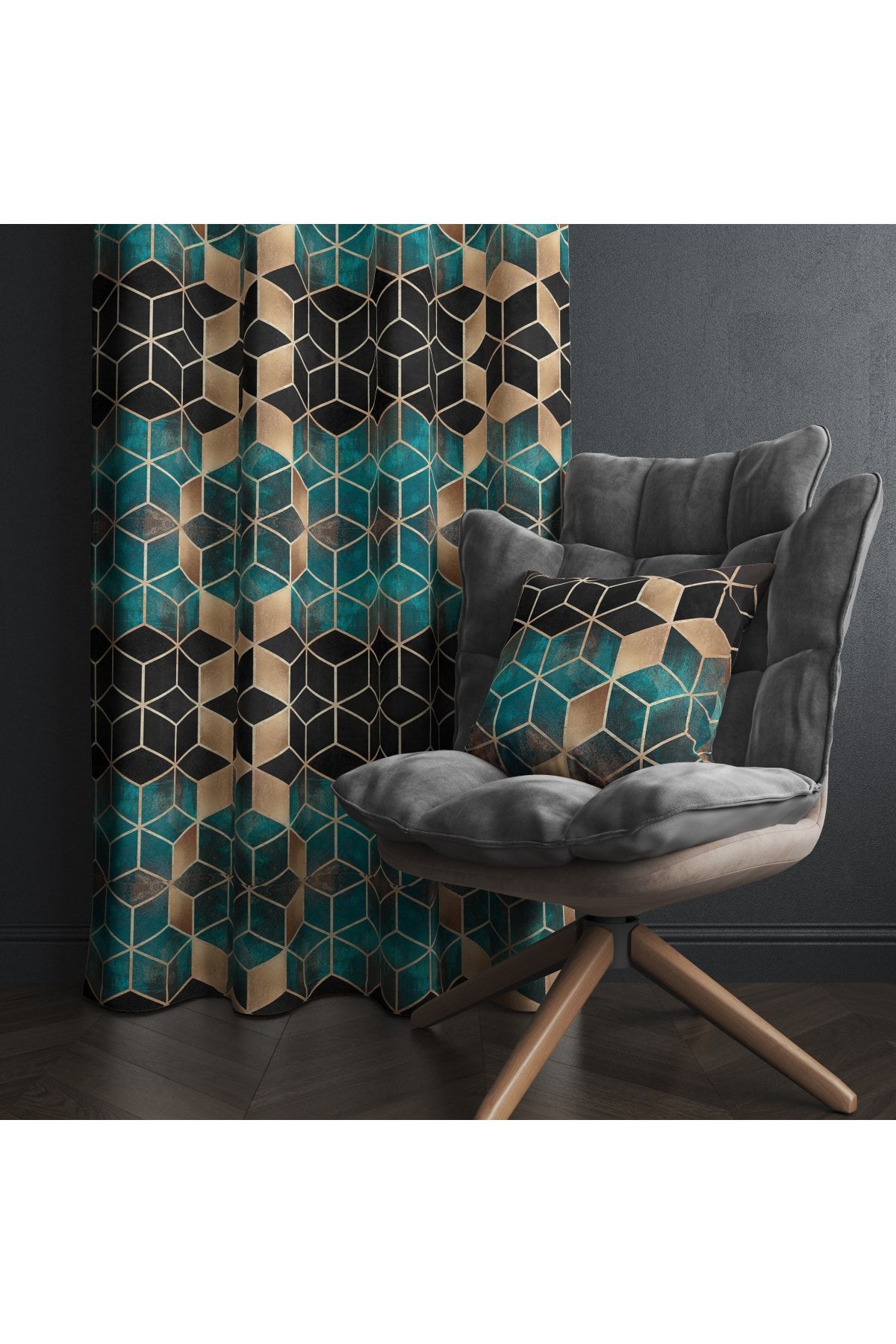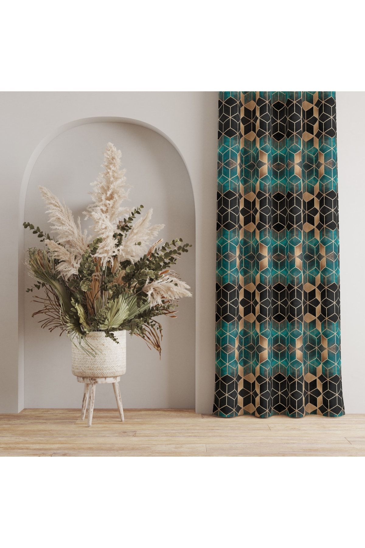 Zümrüt Yeşili Mozaik Desenli Dijital Baskılı Fon Perde Tek Kanat